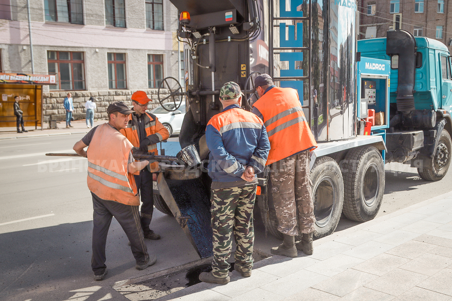 Завершается ремонт площади Ленина. На помощь подрядчику пришло городское дорожное управление. С помощью предоставленной установки «Кохер» специальным составом был заделан шов, соединяющий новую плитку уральского гранита и асфальтовое покрытие у гостиницы «Десна».