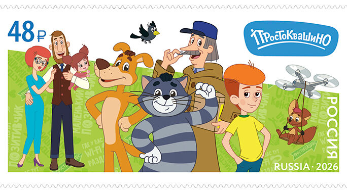 На марках изображены главные персонажи трёх мультфильмов: медвежонок Умка, кот Матроскин, Дядя ...